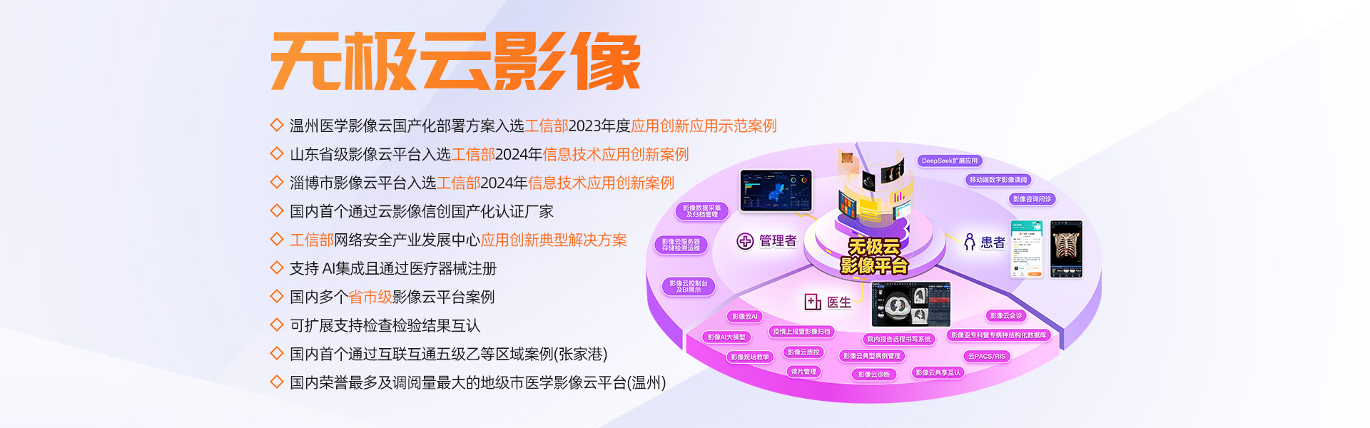 擁有多家年門診量400多萬以上人次的大型三甲醫(yī)院全院PACS及云影像案例,多個省市規(guī)模醫(yī)學(xué)影像云平臺案例,承建的溫州市醫(yī)學(xué)影像云平臺榮獲浙江省最多跑一次改革十佳案例、省領(lǐng)跑者定位題詞、全國惠民便民優(yōu)秀案例、基于影像云AI分析試點單位等榮譽。